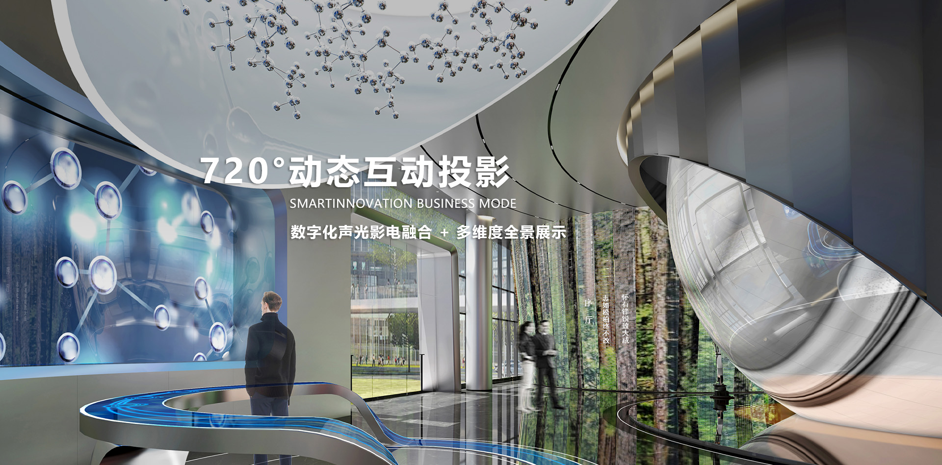 數(shù)字技術(shù): 玻璃幕墻 、 270度弧幕影院 、 互動(dòng)拍照摳像系統(tǒng)等